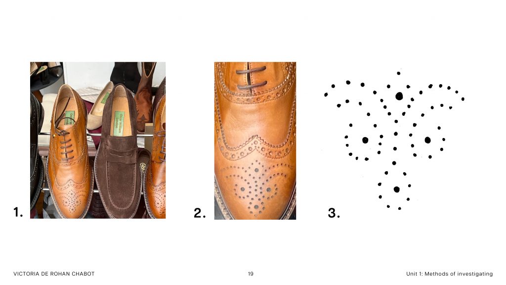 As mentioned, enriched by the author’s efforts to seize the most ordinary items, I notice the brogue perforations decorating almost every pair of shoes in the shop.